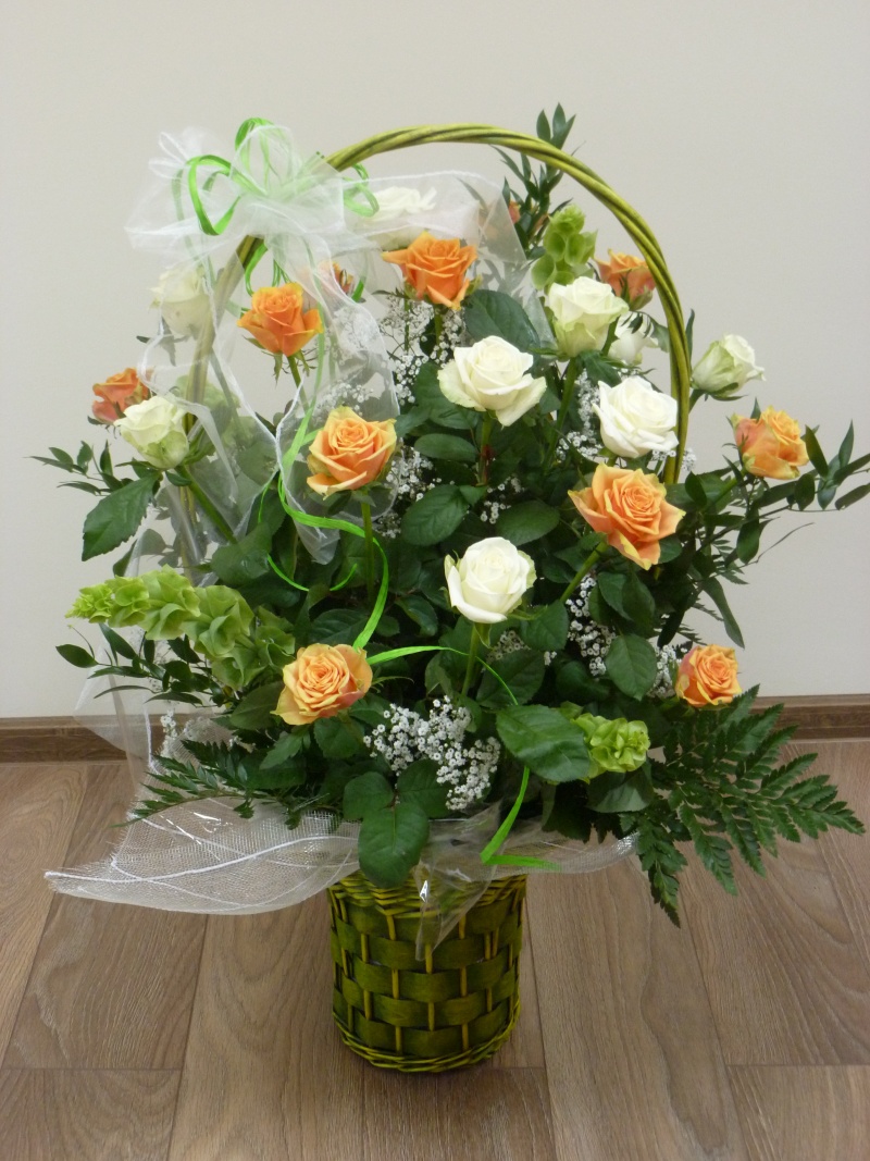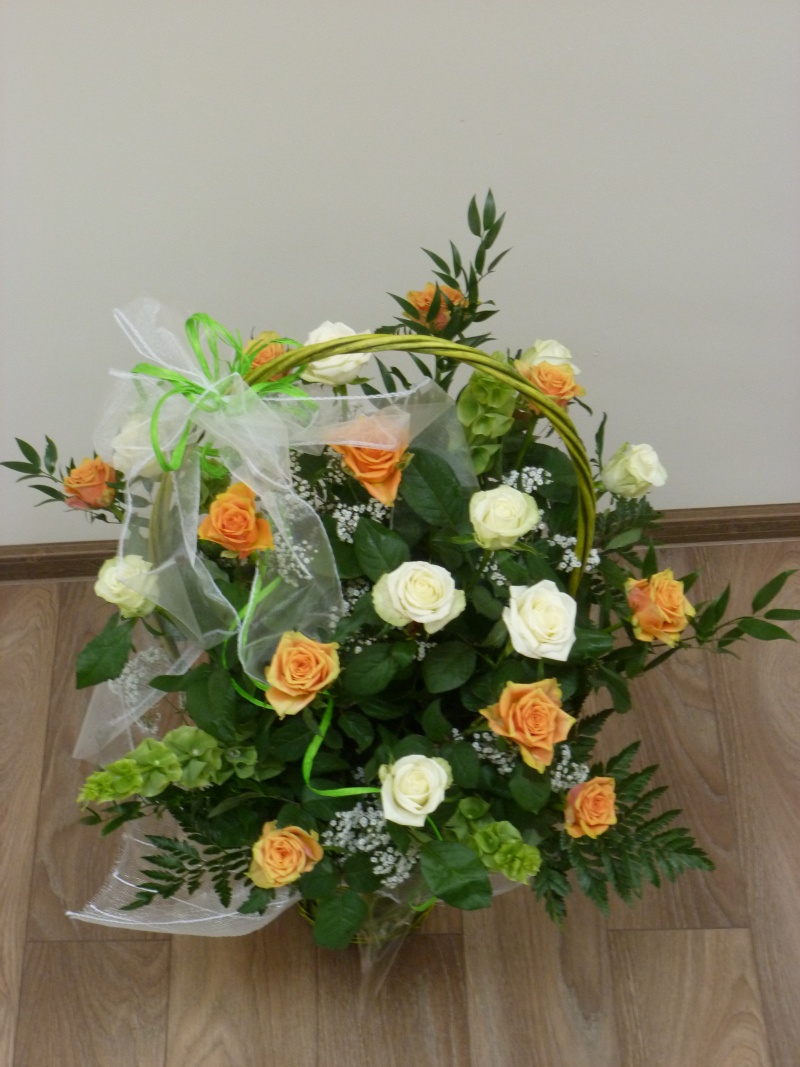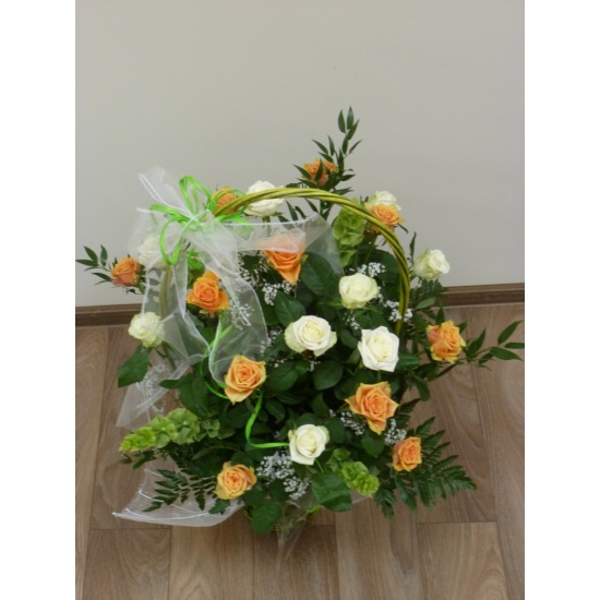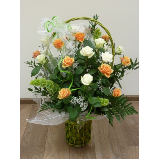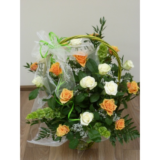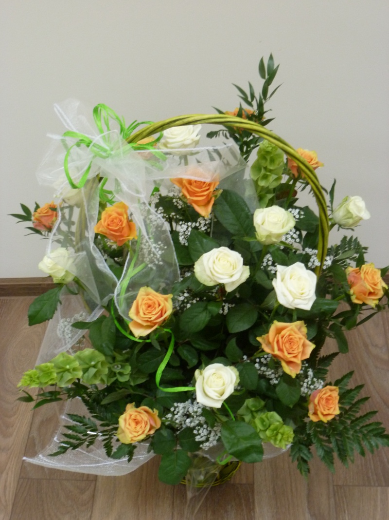 Kosz kwiatowy wykonany z kwiatów ciętych :25 róż, morucelli , zieleni dekoracyjnej . Całość ozdobiona kokardą oraz siatką florystyczną.