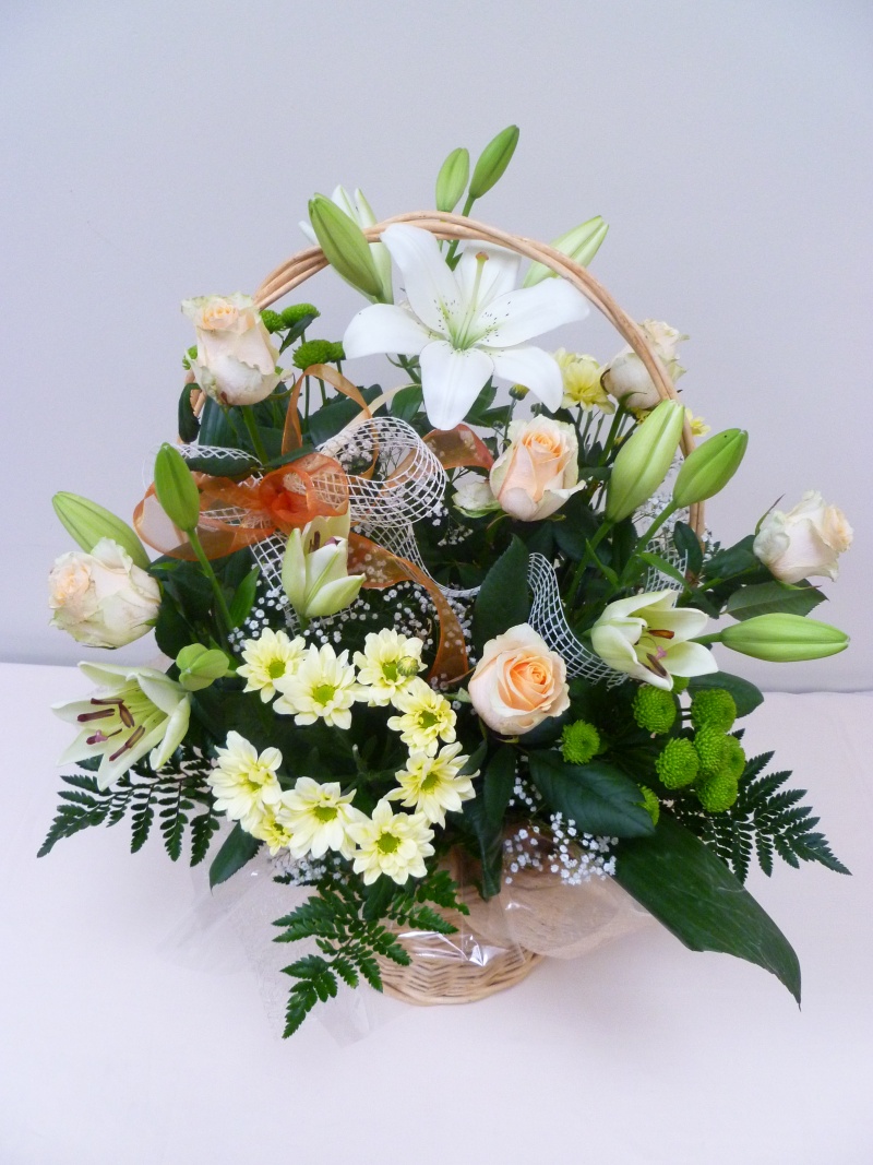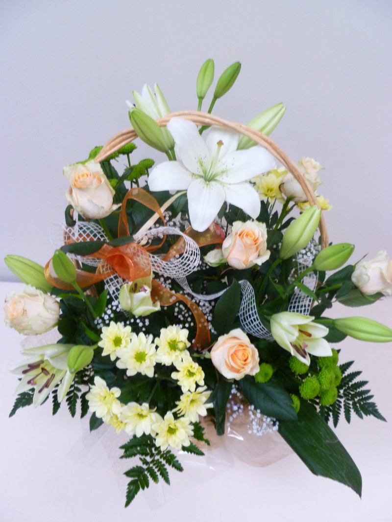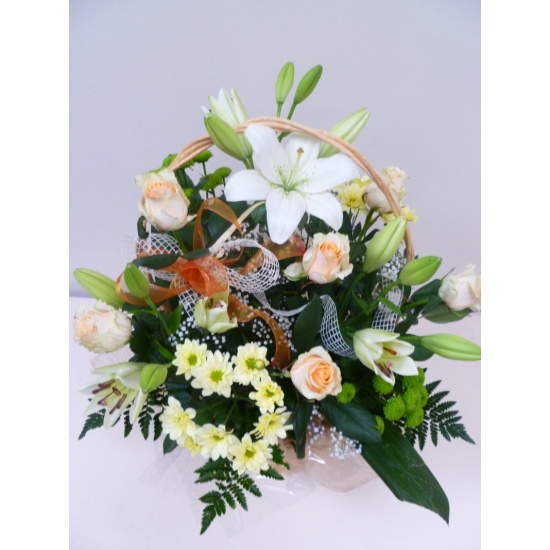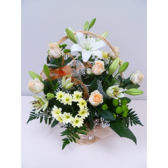 Kosz kwiatowy wykonany z kwiatów ciętych : róża, lilia ,margaretka zieleń ,ozdobiony kokardą oraz organzą florystyczną.