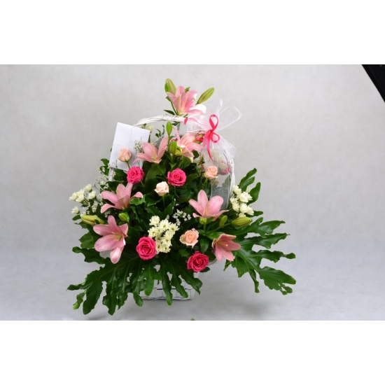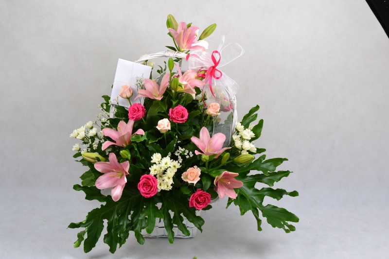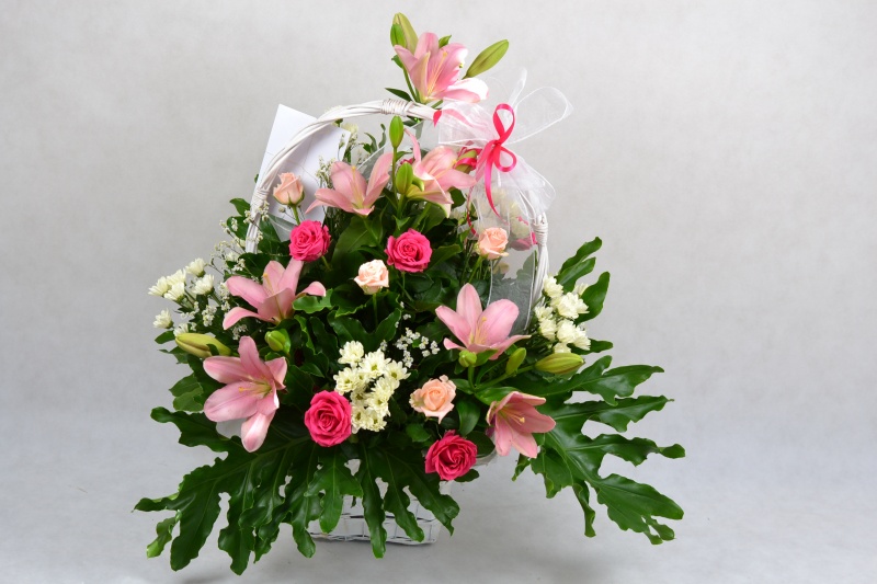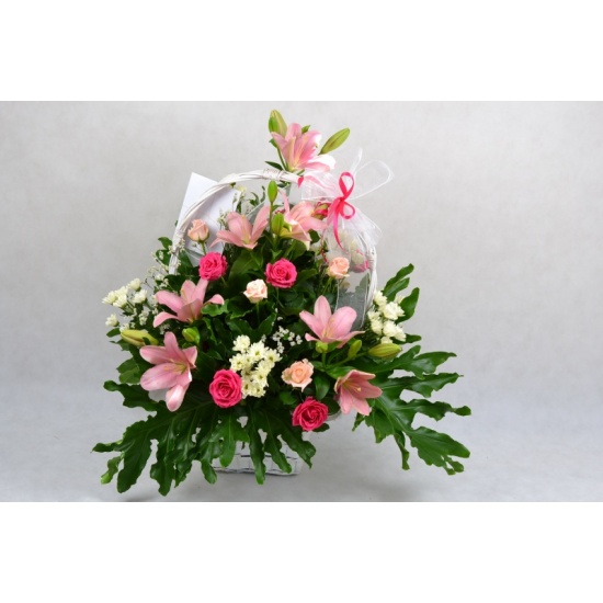 Kosz wykonany z kwiatów ciętych, mieszany; lilia, róża, margaretka, gipsówki z dodatkiem zieleni dekoracyjnej, ozdobiony kokardą.