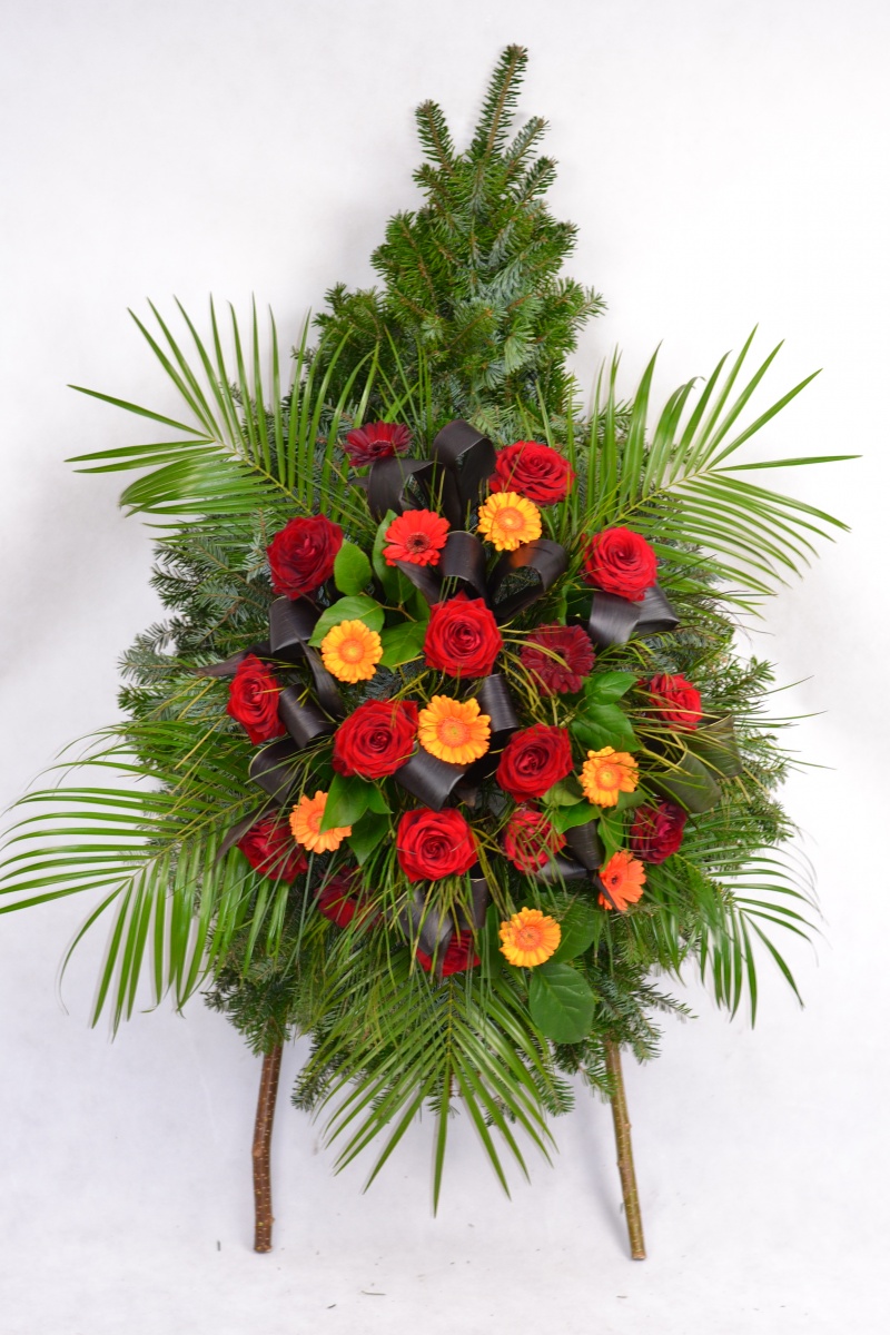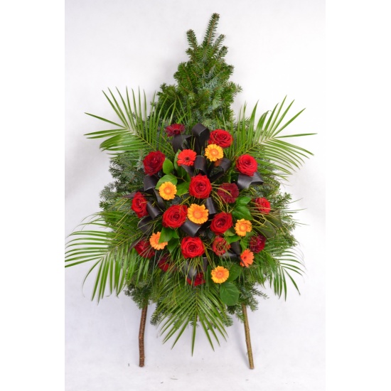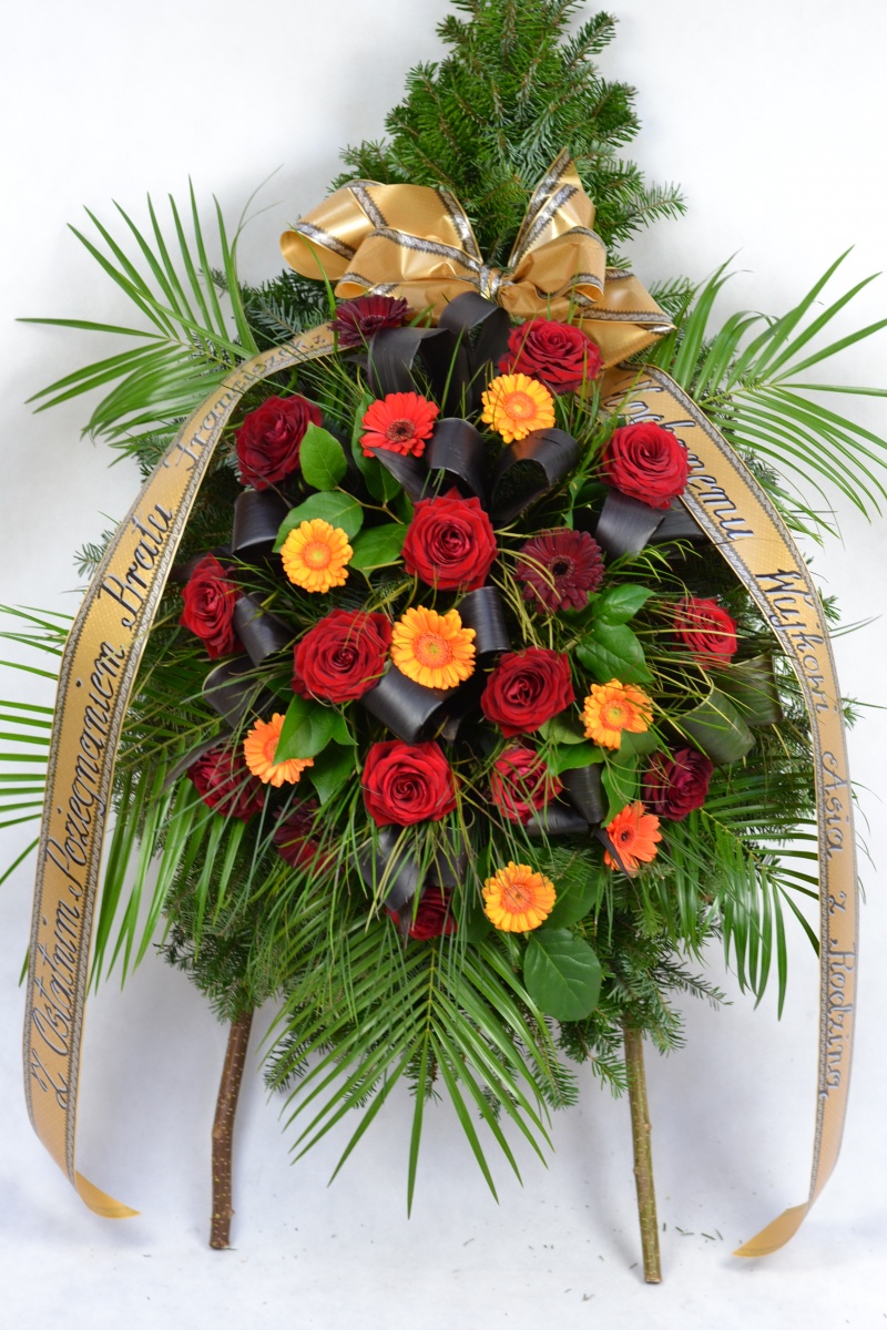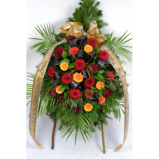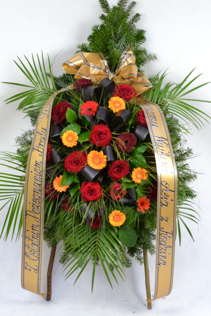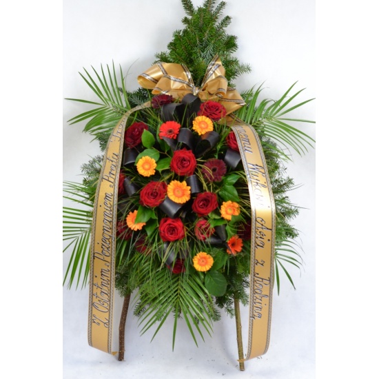 Wieniec pogrzebowy wykonany na żywym podkładzie z jedliny z kwiatów ciętych: róży i gerbery z dodatkiem zieleni dekoracyjnej. Całość ozdobiona szarfą pogrzebową.