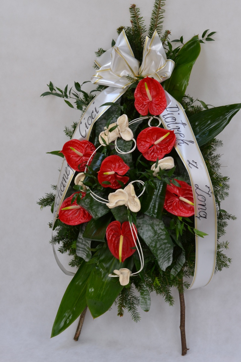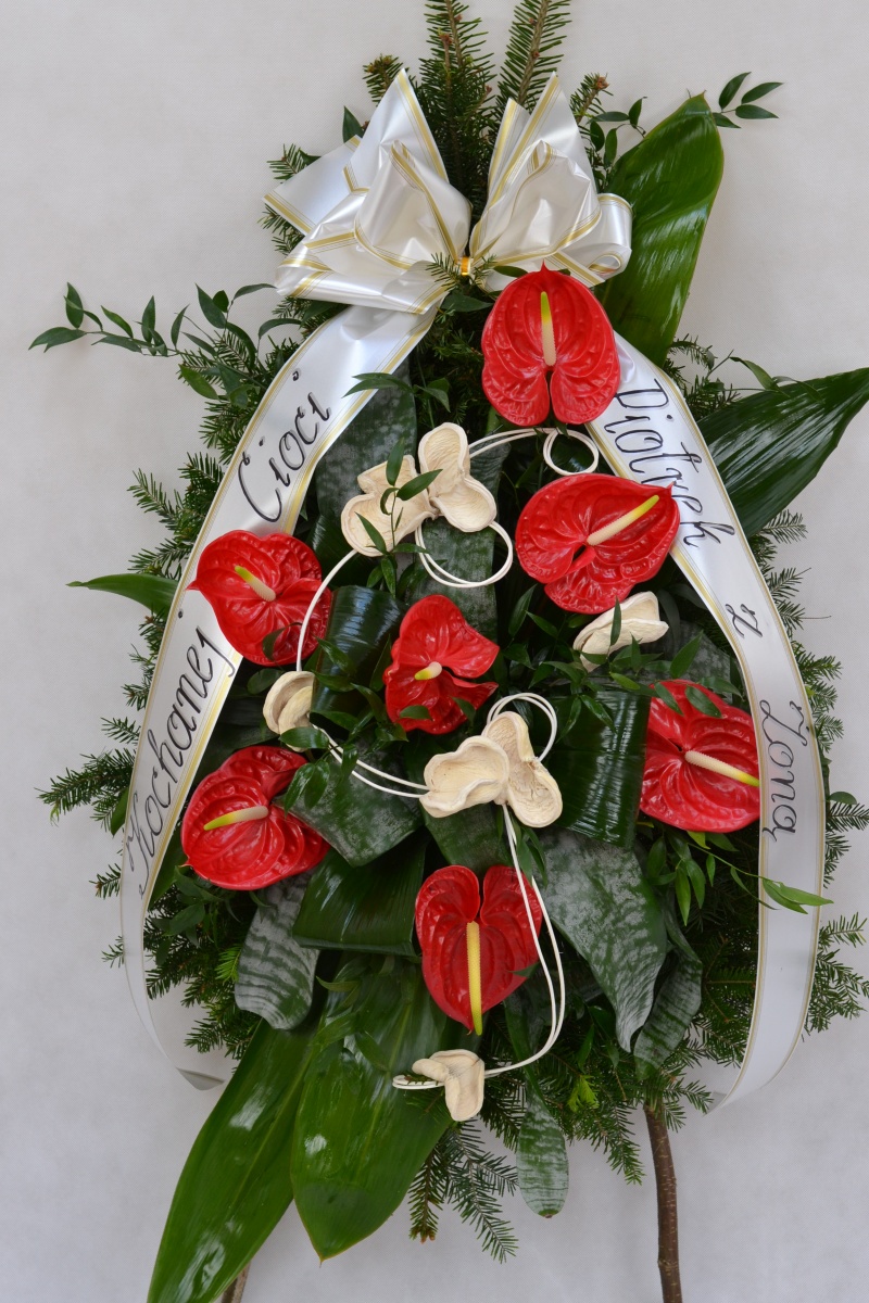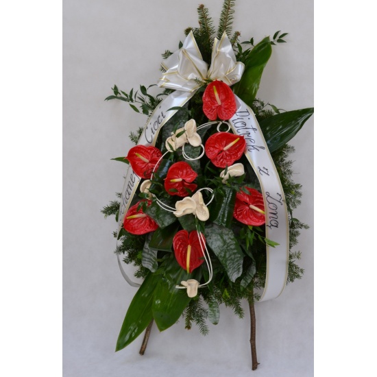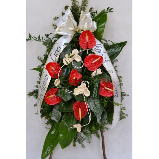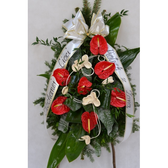 Wieniec pogrzebowy wykonany na żywym podkładzie z jedliny z kwiatów ciętych anturiumz dodatkiem zieleni i suszu dekoracyjnego. całośc ozdobiona szarfa pogrzebową.