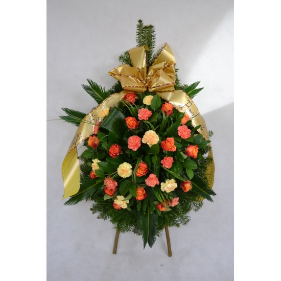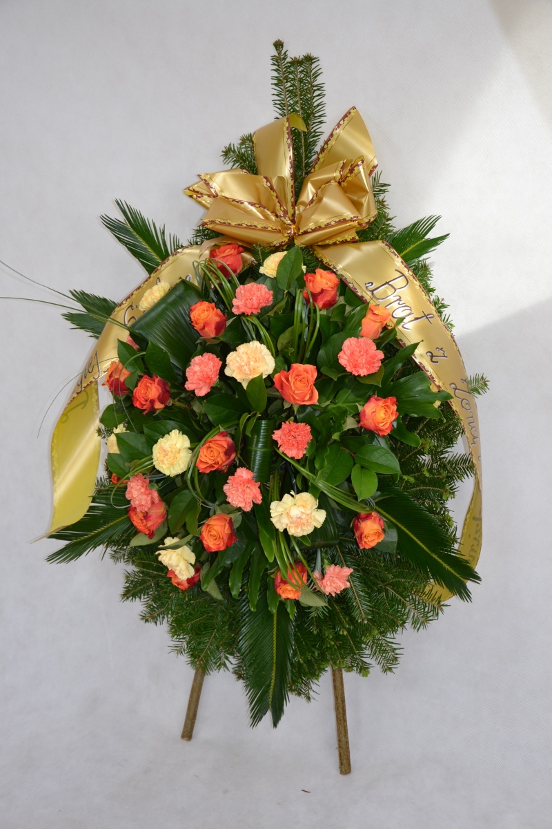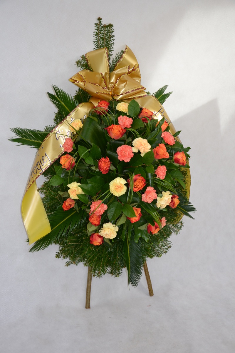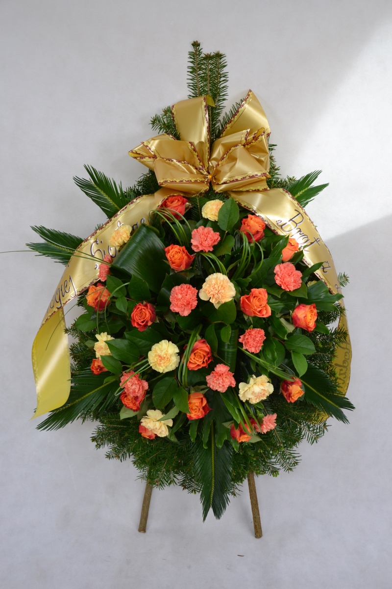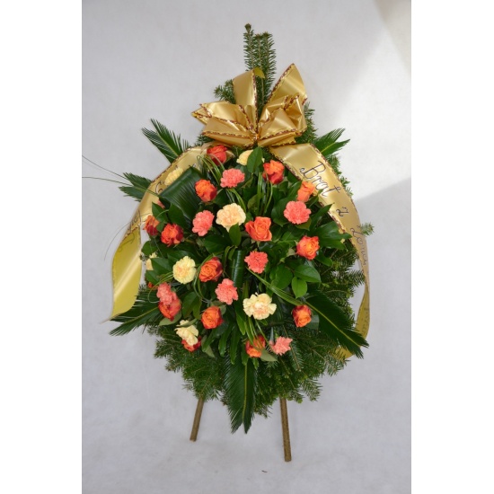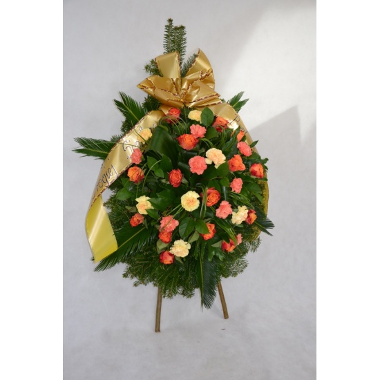 Wieniec pogrzebowy wykonany na żywym podkładzie z jedliny z kwiatów cietych: róży i goździka z dodatkiem zieleni dekoracyjnej. Całość ozdobiona szarfa pogrzebową.