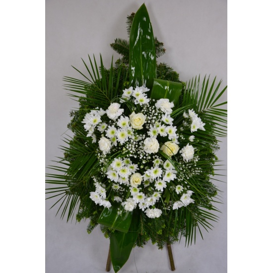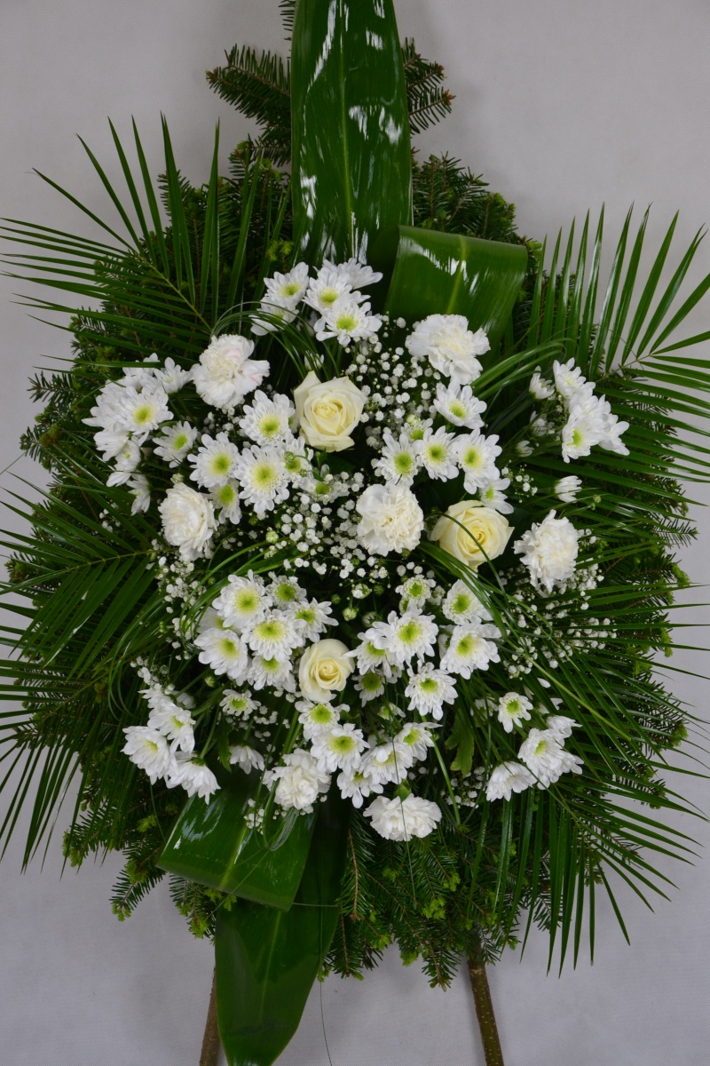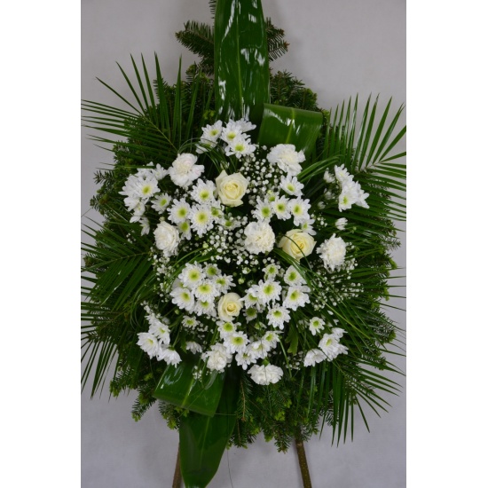 Wieniec pogrzebowy wykonany na żywym podkładzie z jedliny z kwiatów ciętych: margaretki, róży białej z dodatkiem zieleni i gipsówki. Całość ozdobiona szarfą pogrzebowa.