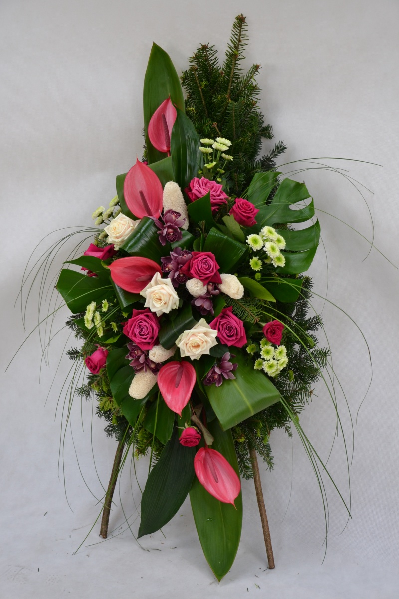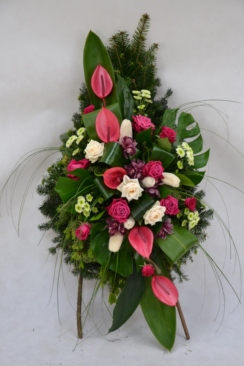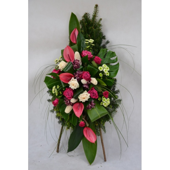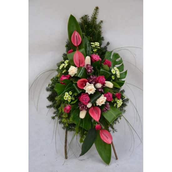 Wieniec pogrzebowy wykonany na żywym podkładzie z jedliny z kwiatów ciętych: anturium, rózy, storczyka cymbidium, margaretki z dodatkiem zieleni i suszu dekoracyjnego. Całość może być ozdobiona szarfa dekoracyjną.