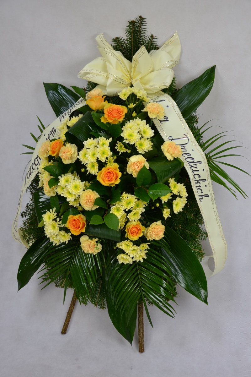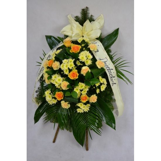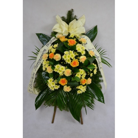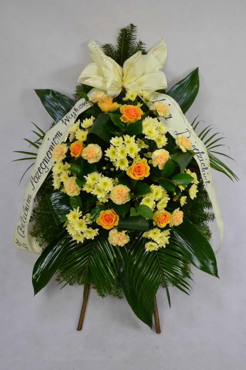Wieniec pogrzebowy wykonany na żywym podkładzie z jedliny z kwiatów cietych: róży, margaretki, goździka i zieleni dekoracyjnej. Całość ozdobiona szarfa pogrzebową.