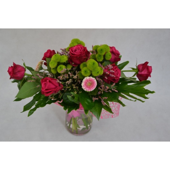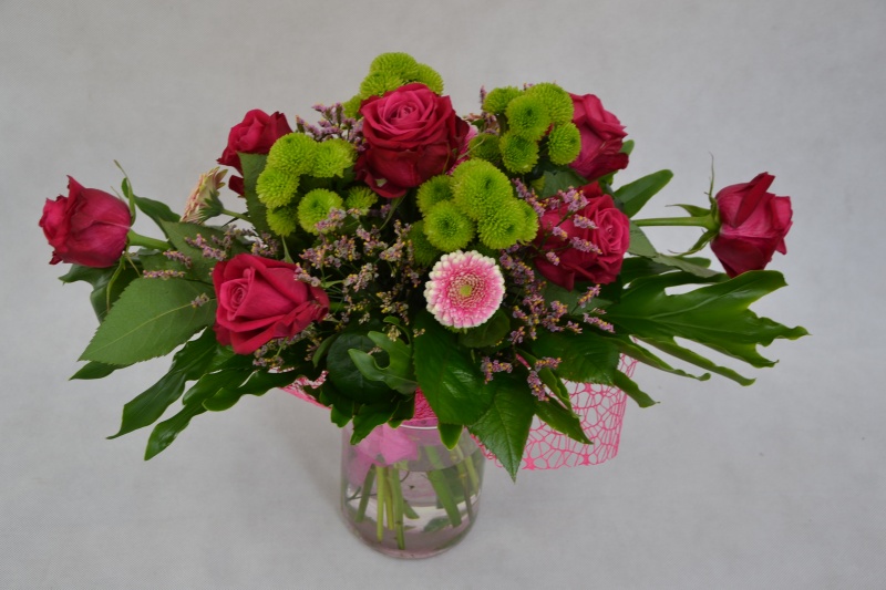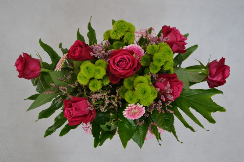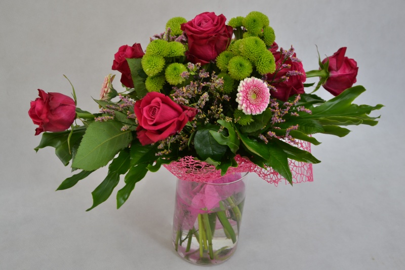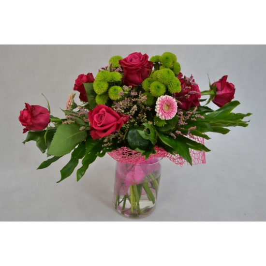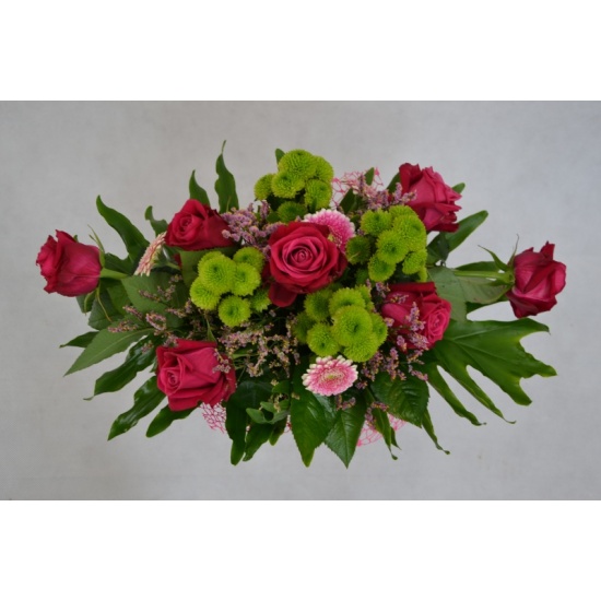 Bukiet kwiatów mieszanych wykonany z: róży, gerbery, margaretki santini z dodatkiem zieleni. Całość ozdobiona siatką dekoracyjną.