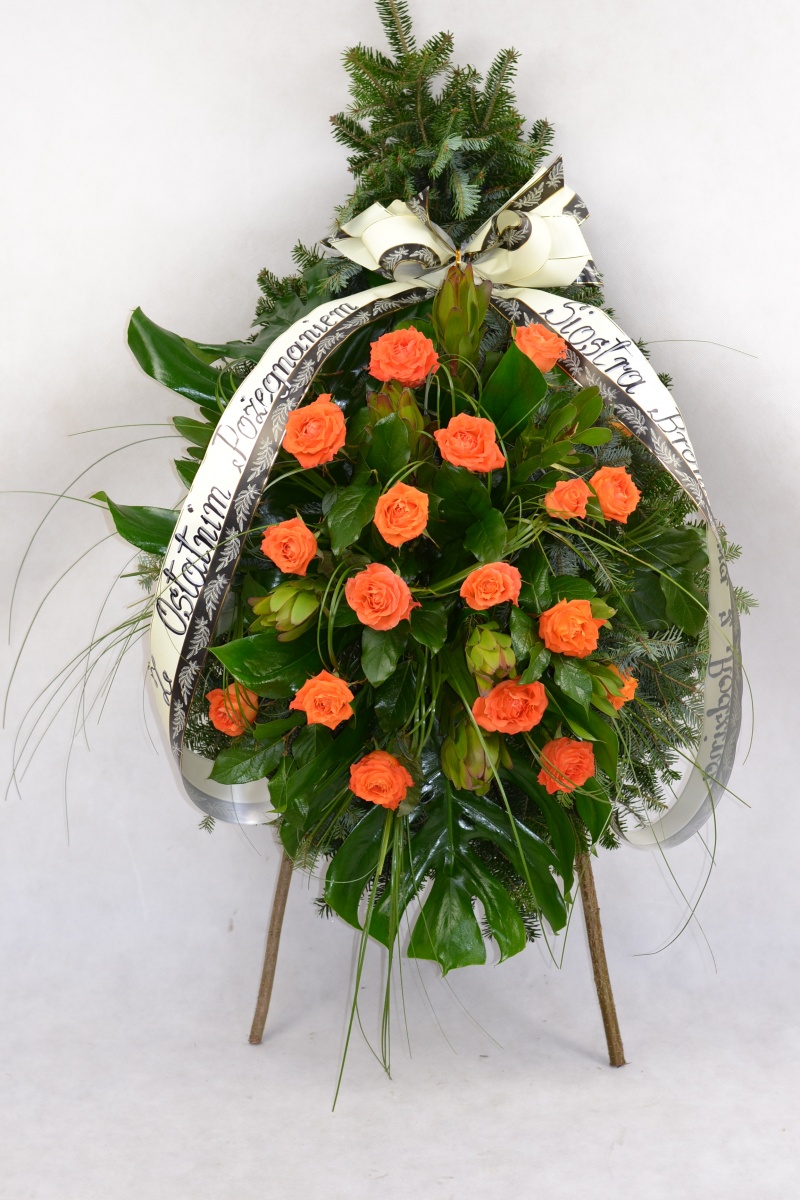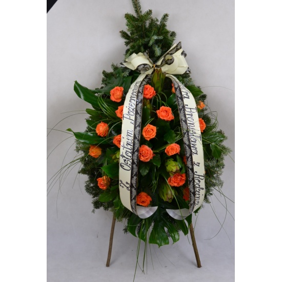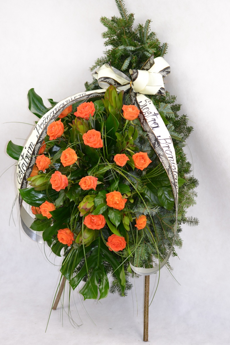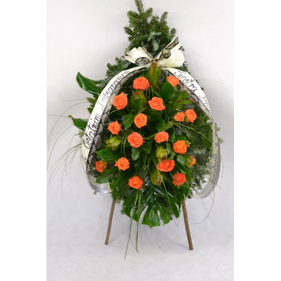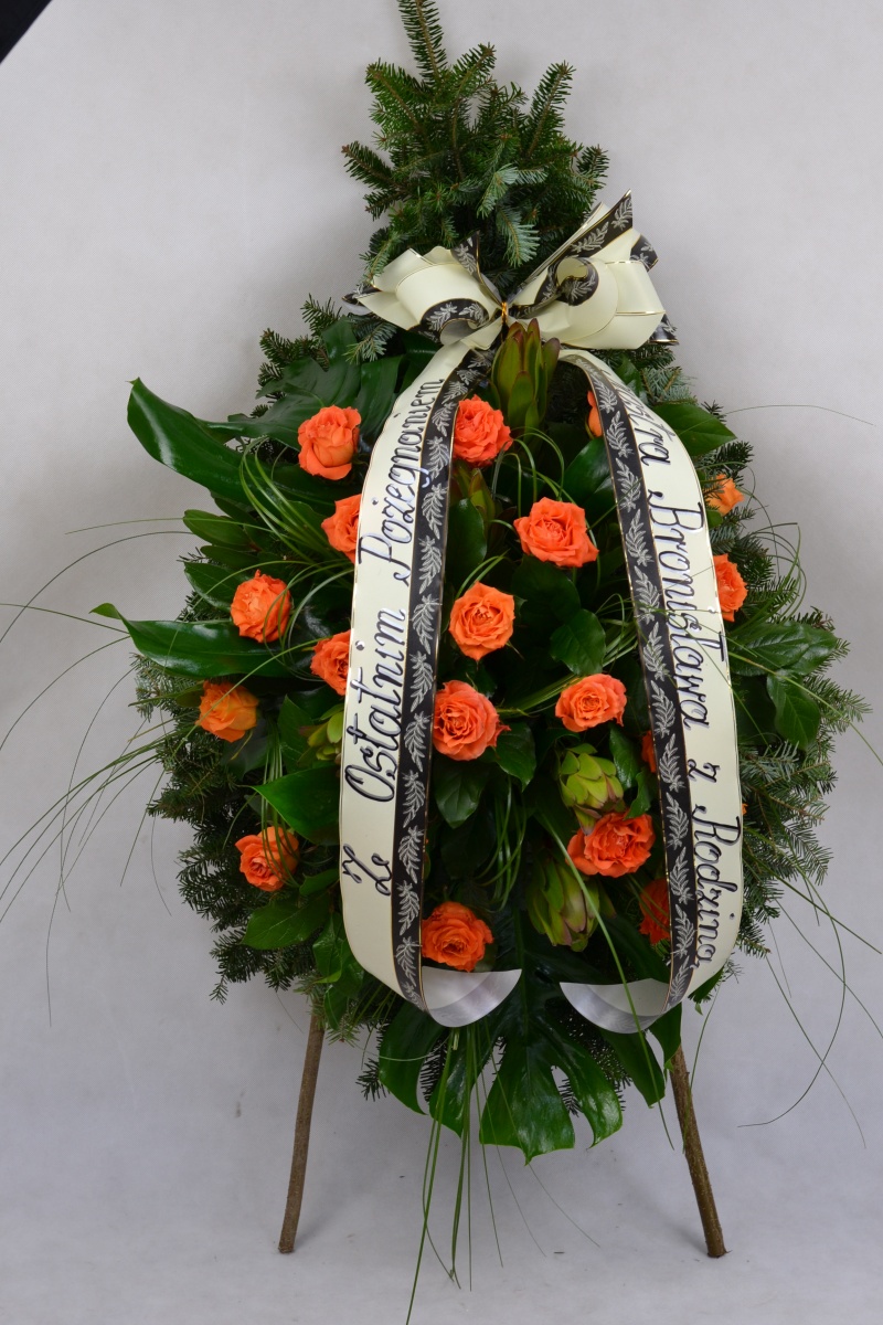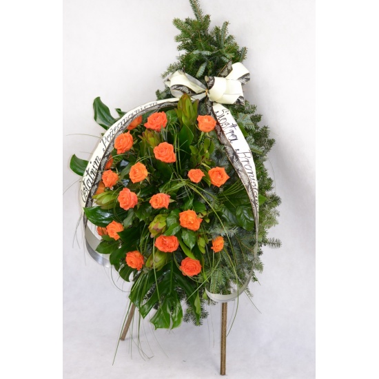 Wieniec pogrzebowy wykonany na żywym podkładzie z jedliny z kwiatów ciętych: róży z dodatkiem zieleni dekoracyjnej. Całość ozdobiona szarfą pogrzebową.