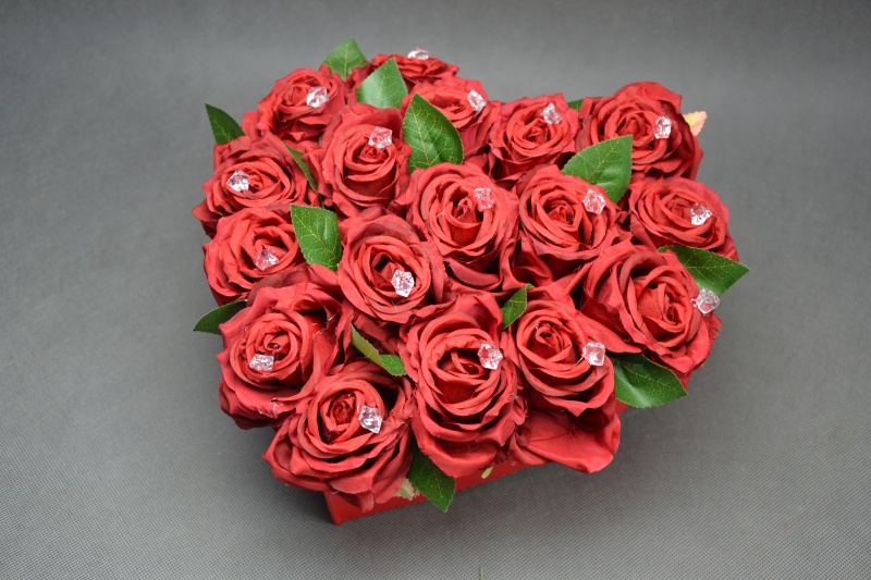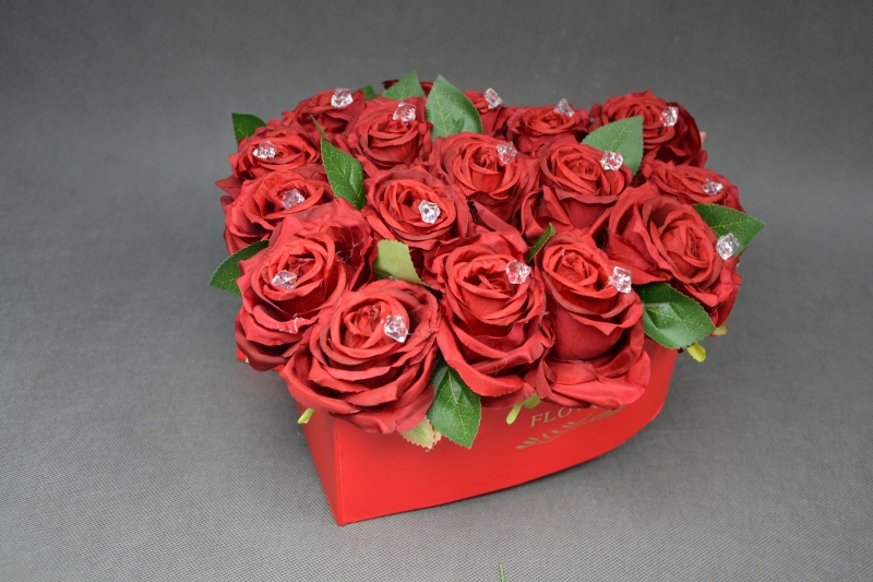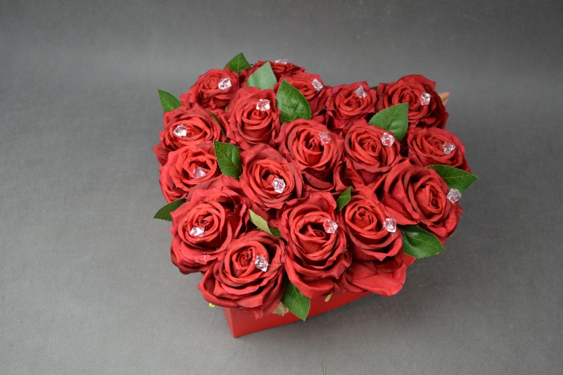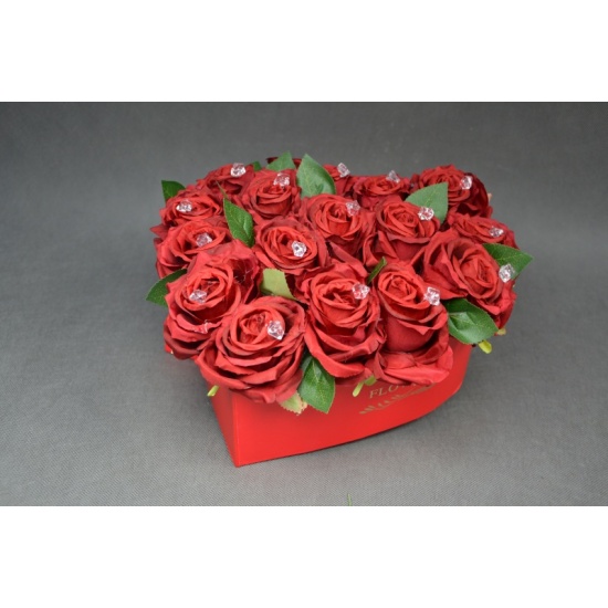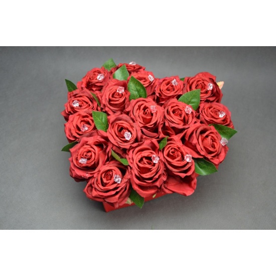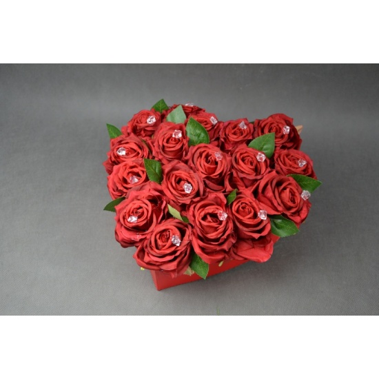Flowerbox w kształcie serca wykonany z 17 sztucznych róż zdobionych kryształkami.