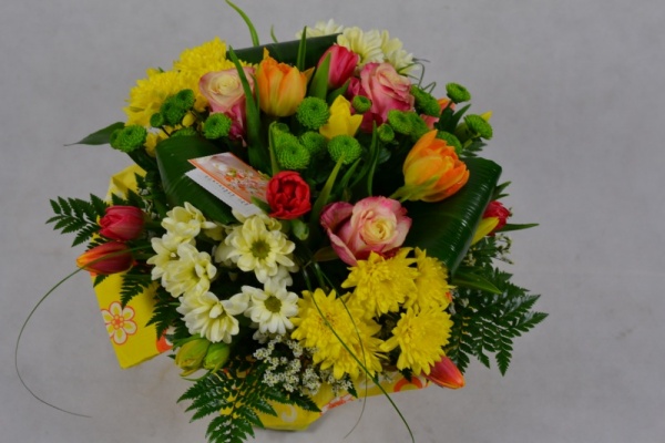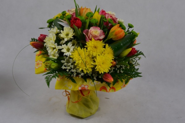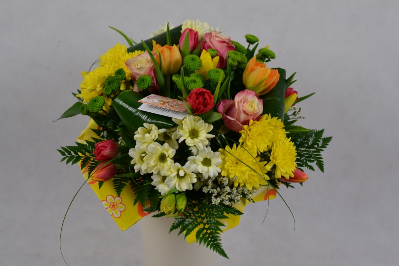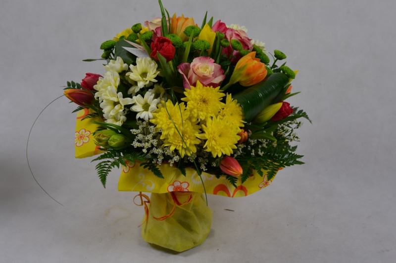 Bukiet wykonany z kwiatów mieszanych: margaretka, tulipan , róża, santini.