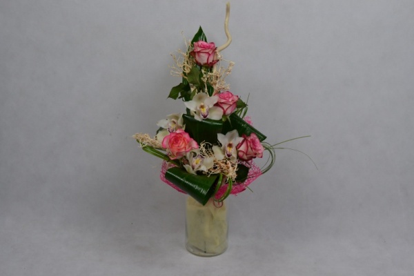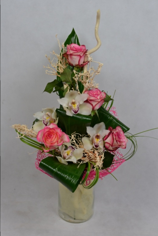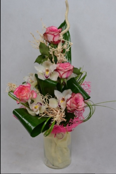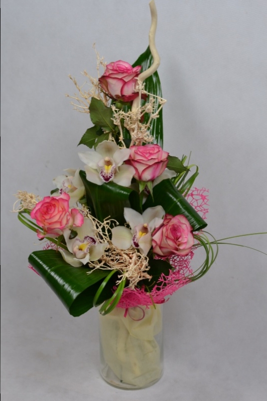 Bukiet kwiatów wykonany z róż ,storczyka oraz liści ozdobnych ozdobiony suszem oraz kryzą koronkową.