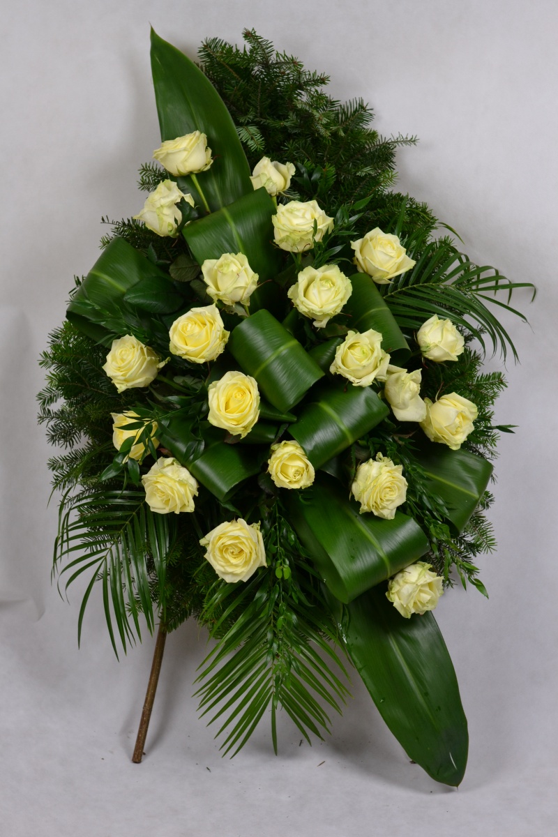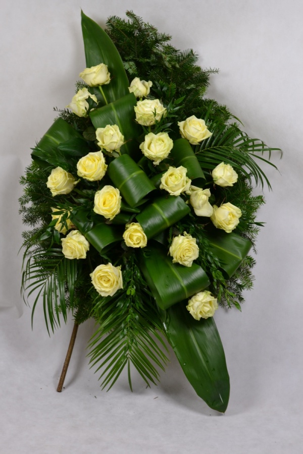 Wieniec pogrzebowy na podkładzie z żywej jedliny wykonany z kwiatów ciętych: róży i przybrania.