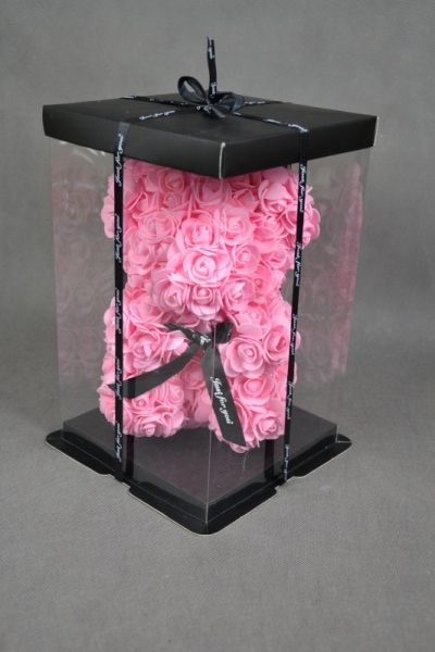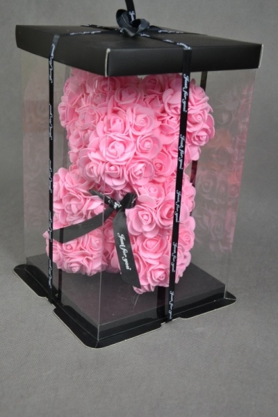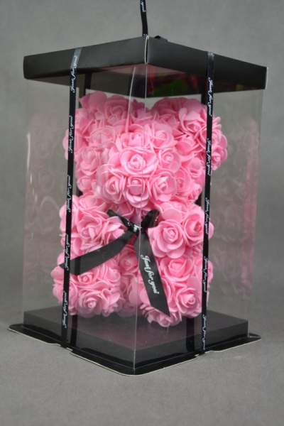 Miś walentynkowy wykonay z rózowych róż piankowych.